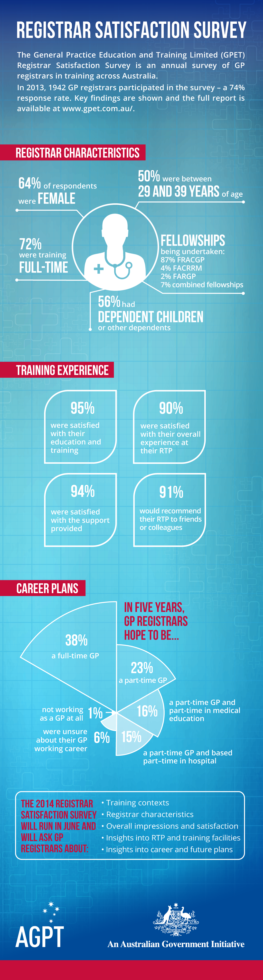 The survey is used for ensuring continuous improvement in the training of doctors in General Practice. It explores issues such as training experiences and impressions, insights into training facilities and the future plans of GP registrars. It also collects important data about the characteristics of registrars so as to build a better understanding of their needs and identify ways to improve training.